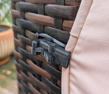 Clips designed to keep your garden cushions perfectly in place. Clips are 3D printed in PETG in the UK
